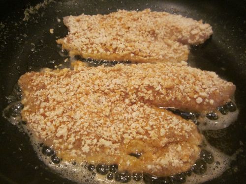Set two of the fillets in the pan and you should hear the oil start to crackle! You want that sizzle sound because that means it's cookin' away! I did two fillets and then waited to do the third one because I didn't want to crowd the pan.
